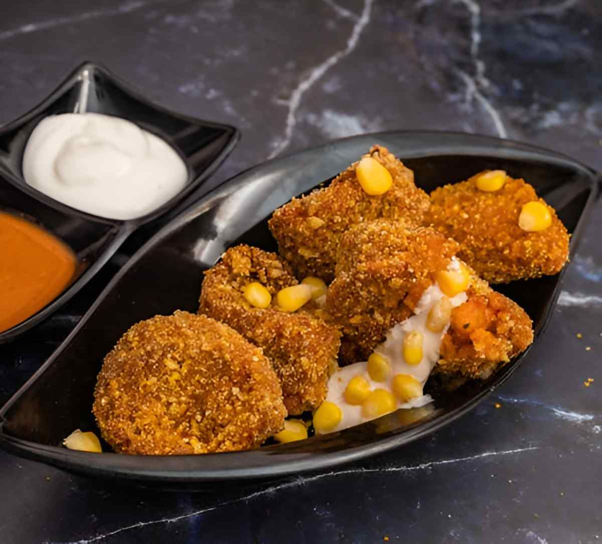 Golden fried momos filled with cheesy corn for a crunchy, creamy bite.