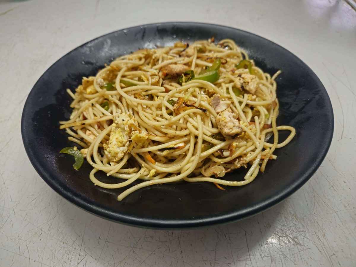 Stir-fried noodles with eggs and tender chicken in bold desi-Chinese spices.