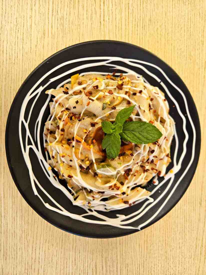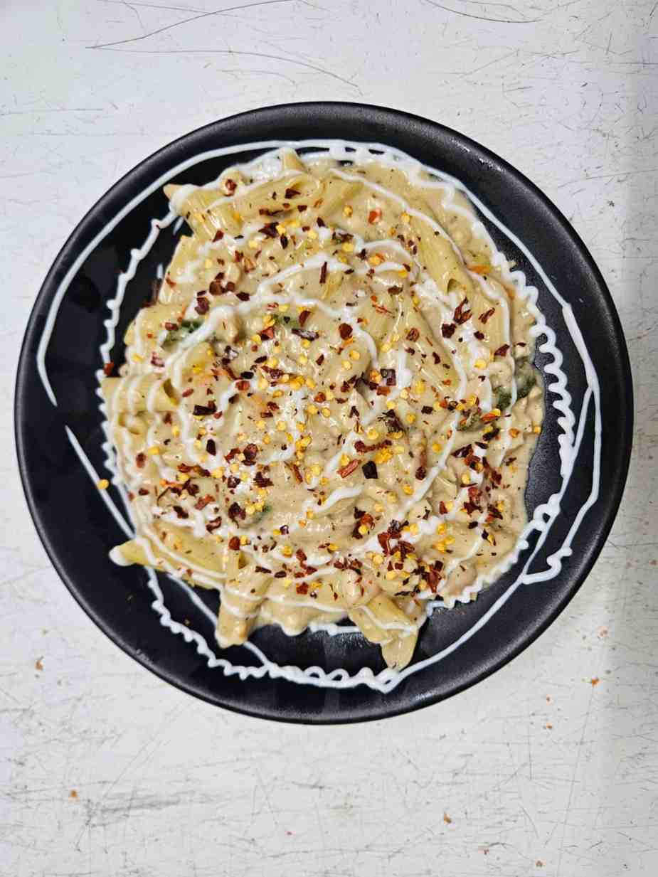 Creamy Alfredo pasta loaded with fresh vegetables and smooth cheesy sauce.