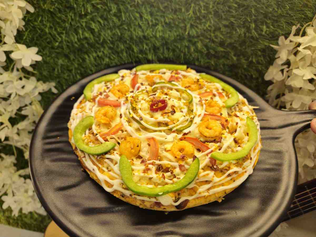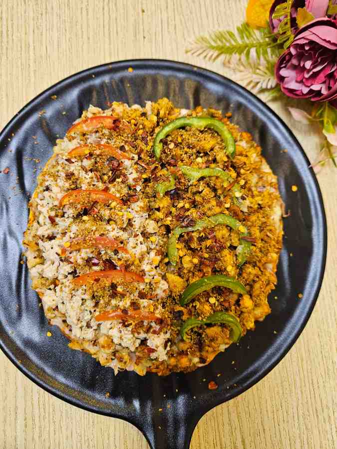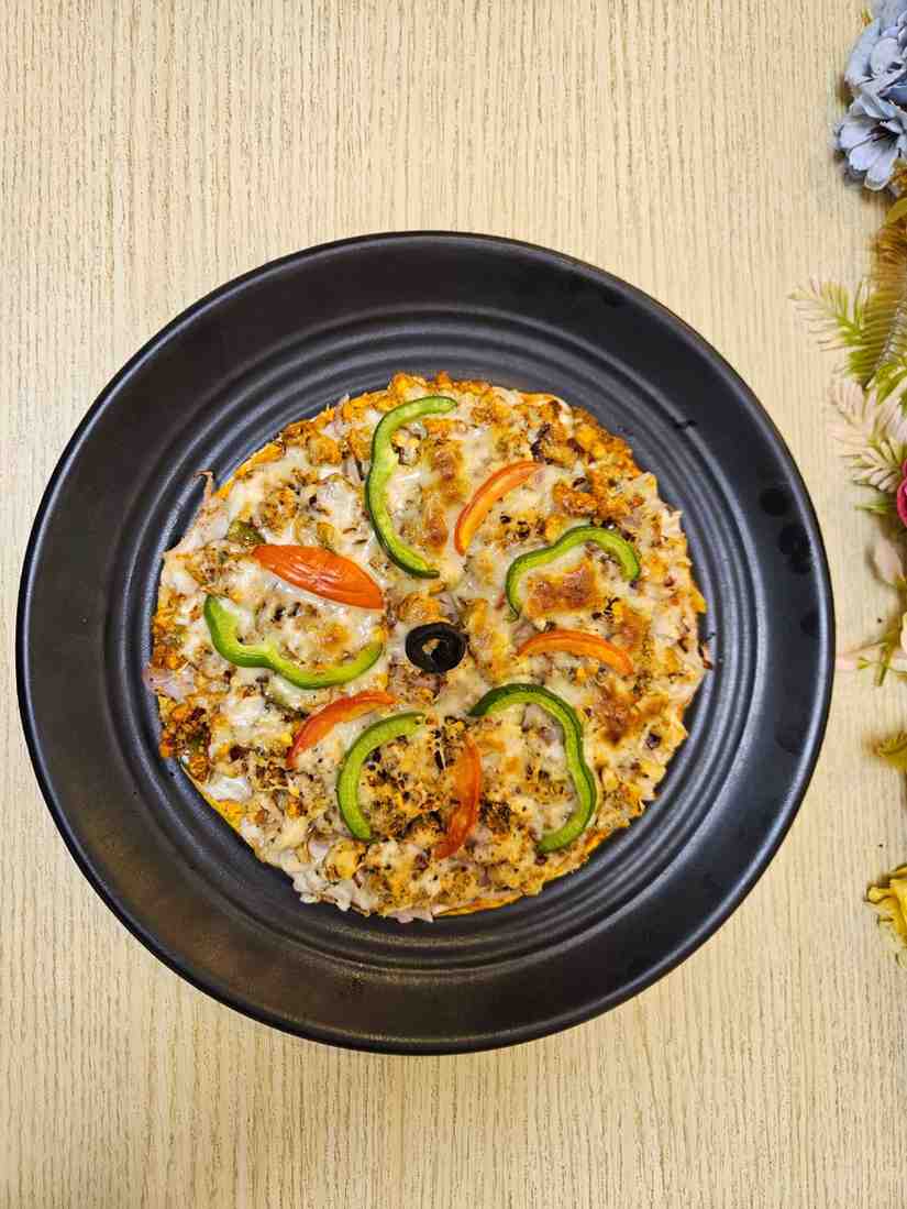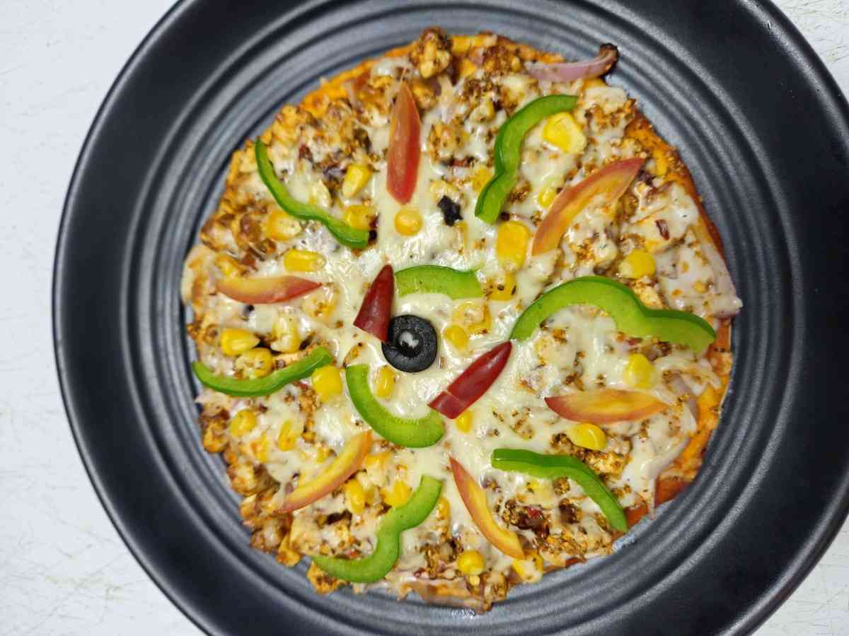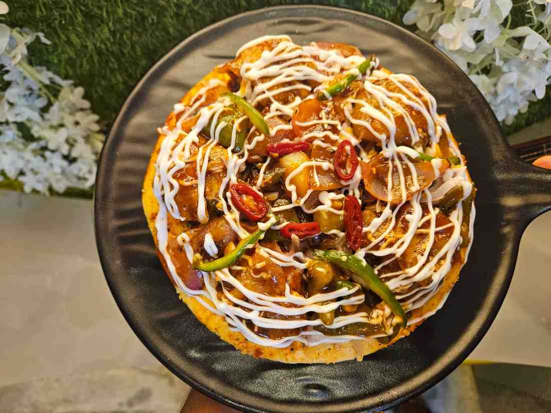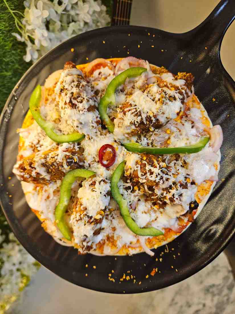 Smoky clay-pot baked pizza loaded with juicy chicken, desi spices, and melted cheese.